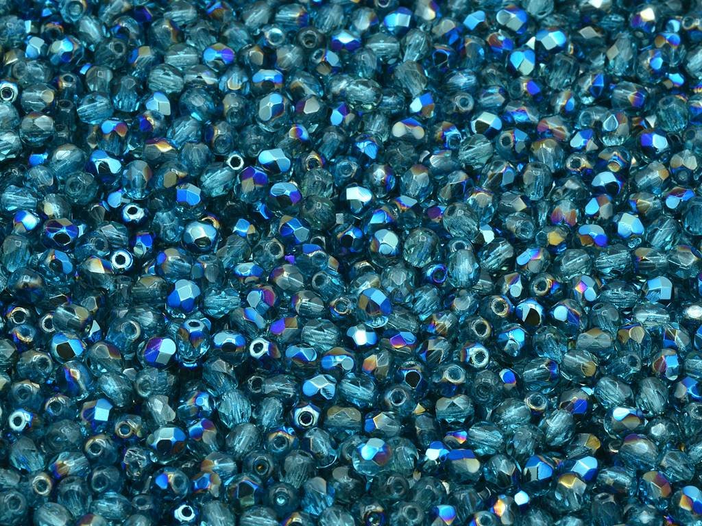 Kvalitní české skleněné broušené korálky tzv. „ohňovky“, o velikosti 4 mm, obsah balení 60 ks nebo níže uvedené. Barva akvamarín s dekorem 22201 (azuro).