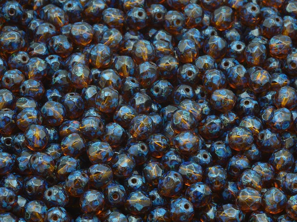Kvalitní české skleněné broušené korálky tzv. „ohňovky“, velikost 6 mm, obsah balení 30 ks nebo níže uvedené. Barva topaz s dekorem 86800 (travertin).
