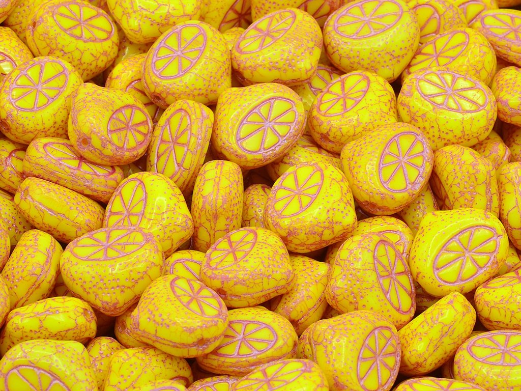 Kvalitní české skleněné korálky ve tvaru citronu, velikost 15 mm, obsah balení 5 ks nebo níže uvedené. Barva sytá žlutá s dekorem 54321.