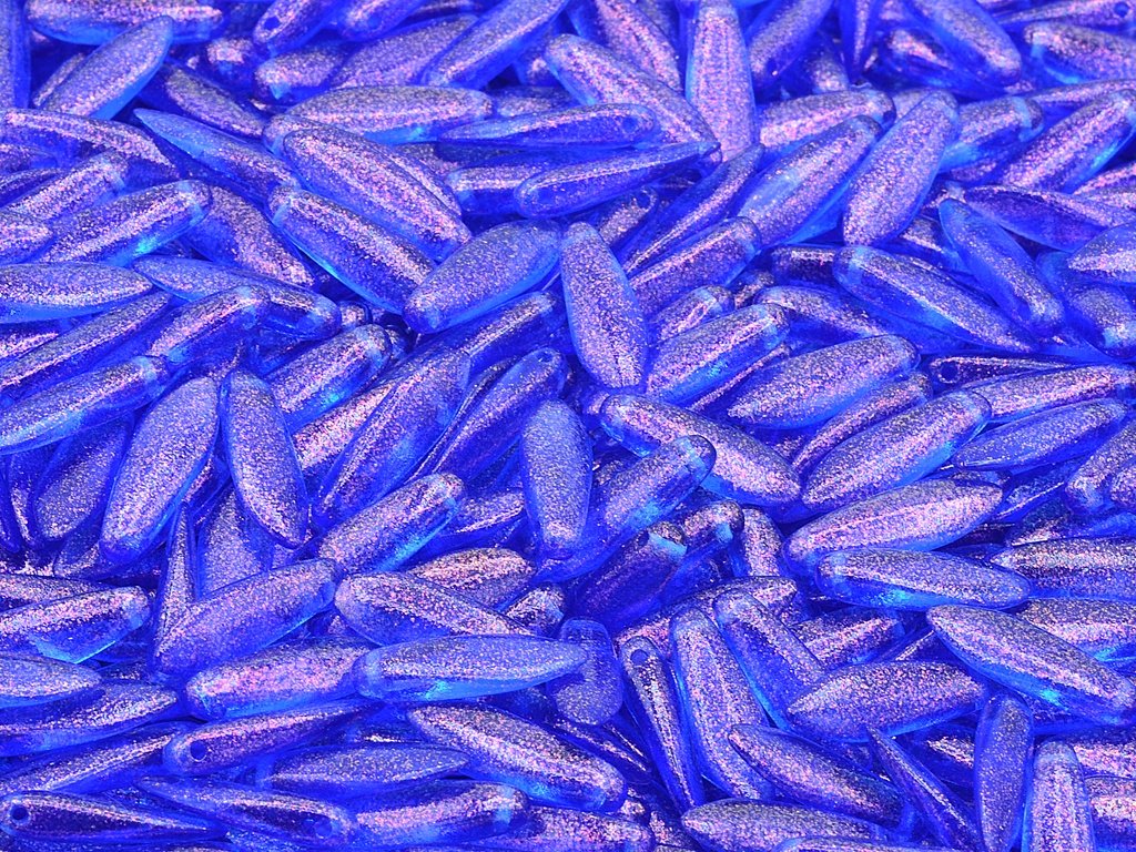 České skleněné korálky ve tvaru jazýčku nebo také jehly, velikost 5x16 mm, obsah balení 15 ks nebo níže uvedené. Barva safír s dekorem 12502.