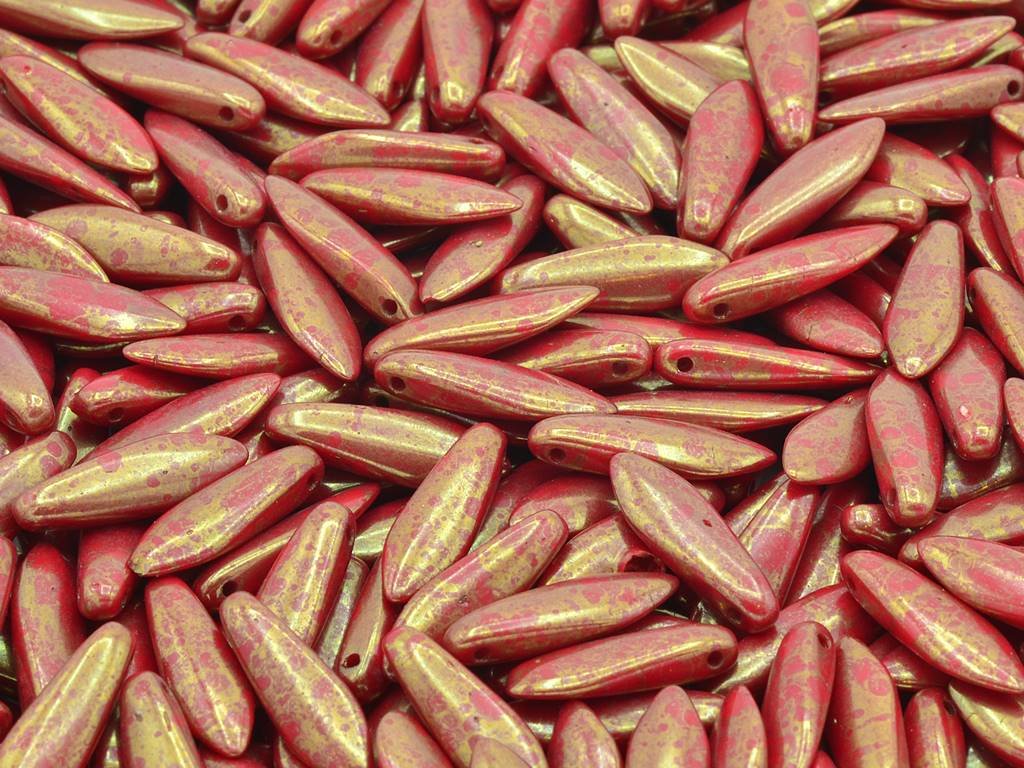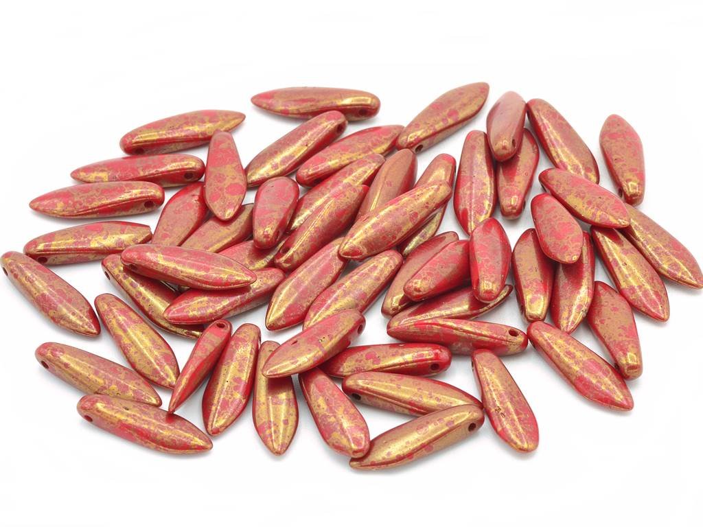 České skleněné korálky ve tvaru jazýčku nebo také jehly, velikost 5x16 mm, obsah balení 15 ks nebo níže uvedené. Barva korál s dekorem 15495.