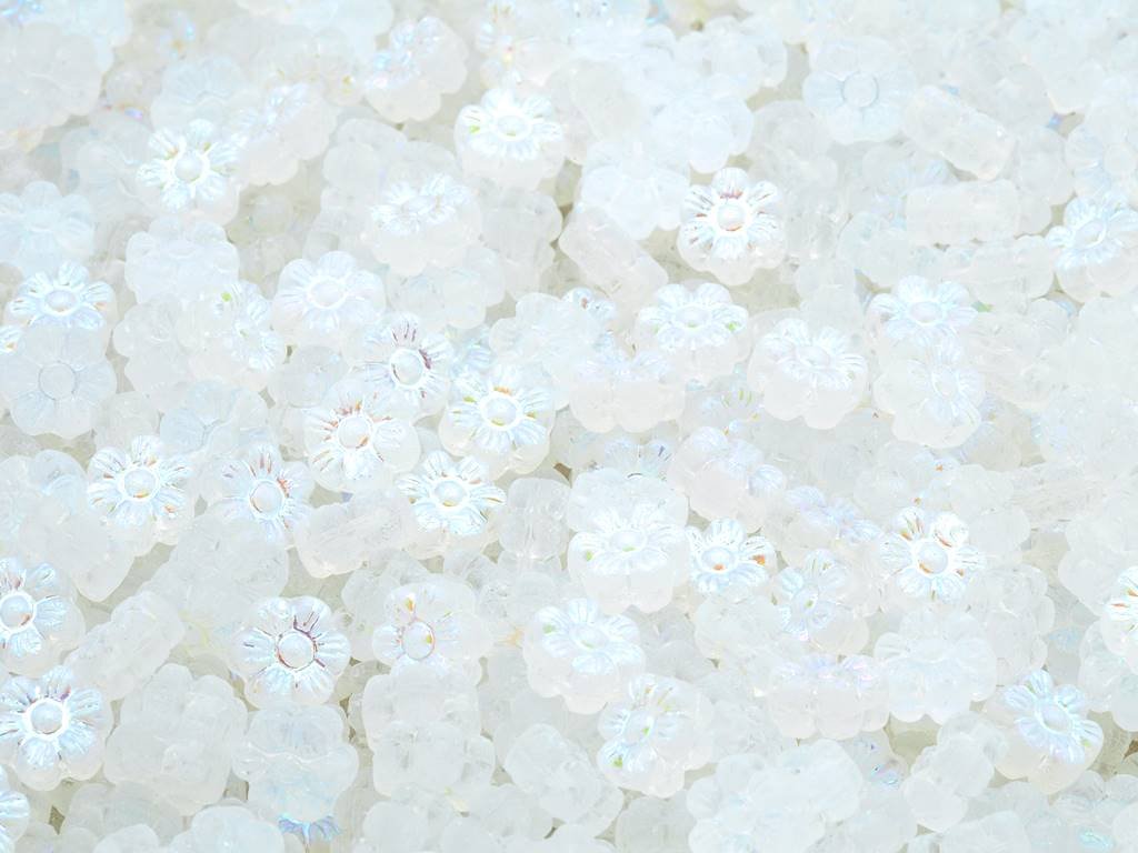 Kvalitní české skleněné korálky ve tvaru kytičky 8 mm, obsah balení 30 ks nebo níže uvedené. Barva křišťál/mat s dekorem 28701 (AB).