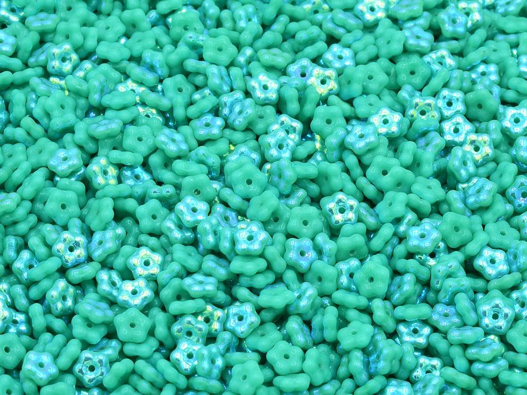 Kvalitní české skleněné korálky ve tvaru kytičky, velikost 5 mm, obsah balení 60 ks nebo níže uvedené. Barva tyrkys s dekore 28701 (AB).Doplňkové parametry