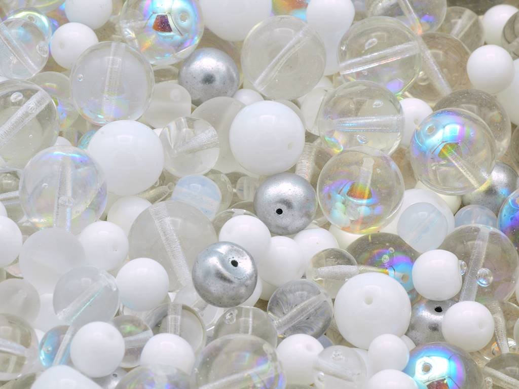 Mix kulatých korálků II. jakosti v různých velikostech v bílé a krystalové barvě. Korálky obsahují drobné výrobní vady jako jsou bublinky, rysky, dírky apod. a jsou vhodné zejména pro školní zařízení, terapeutické účely. Obsah balení 250 g nebo níže uvedené.
