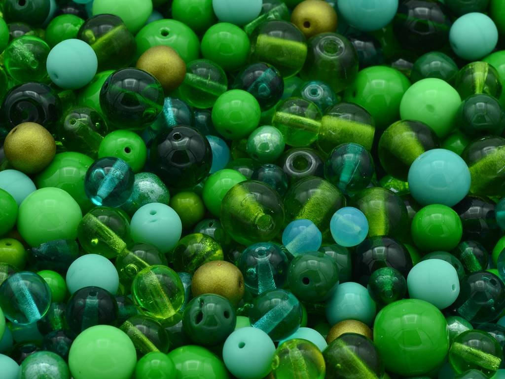 Mix kulatých korálků II. jakosti v různých velikostech v zelené barvě. Korálky obsahují drobné výrobní vady jako jsou bublinky, rysky, dírky apod. a jsou vhodné zejména pro školní zařízení, terapeutické účely. Obsah balení 250 g nebo níže uvedené.