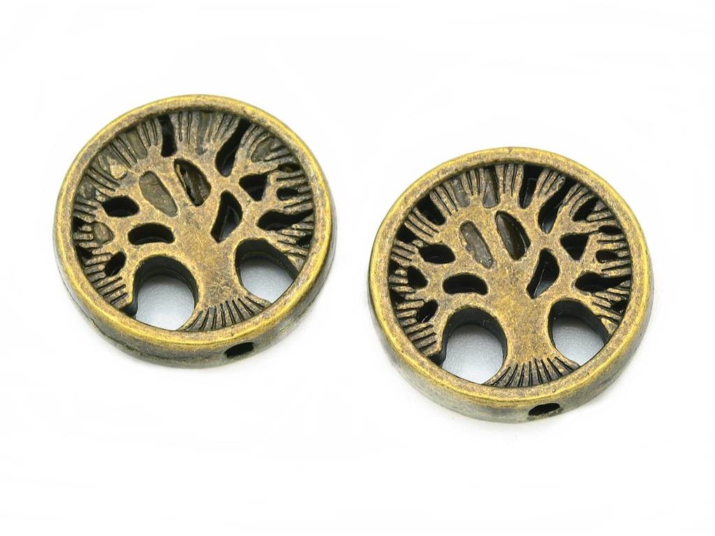Korálky ze zinkové slitiny dekorované v tibetském stylu, používané jako oddělovače jiných korálků, ve tvaru stromu života o rozměru 18 x 18 x 4 mm a s dírkou pro průvlek o průměru 1,5 mm. Korálky ze zinkové slitiny se běžně označují jako korálky vyrobené z bižuterního kovu.