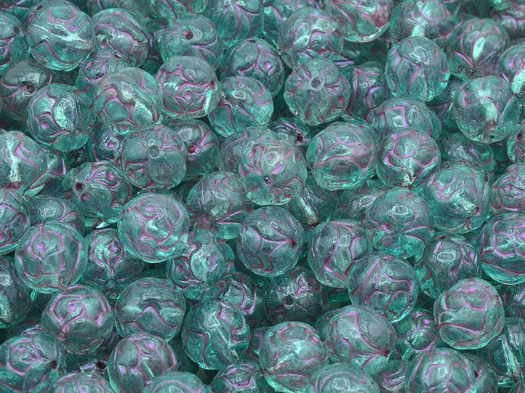 České mačkané skleněné korálky s reliéfem růže, velikost 10 mm, obsah balení 15 ks nebo níže uvedené, barva křišťál s kombinací dekorů 43807 a 34309.