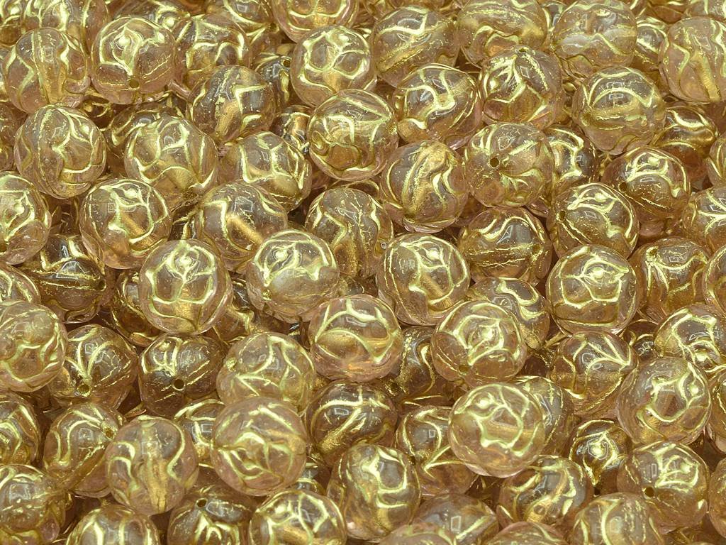 České mačkané skleněné korálky s reliéfem růže, velikost 10 mm, obsah balení 15 ks nebo níže uvedené, barva rozalín se zlatým zátěrem 54202.