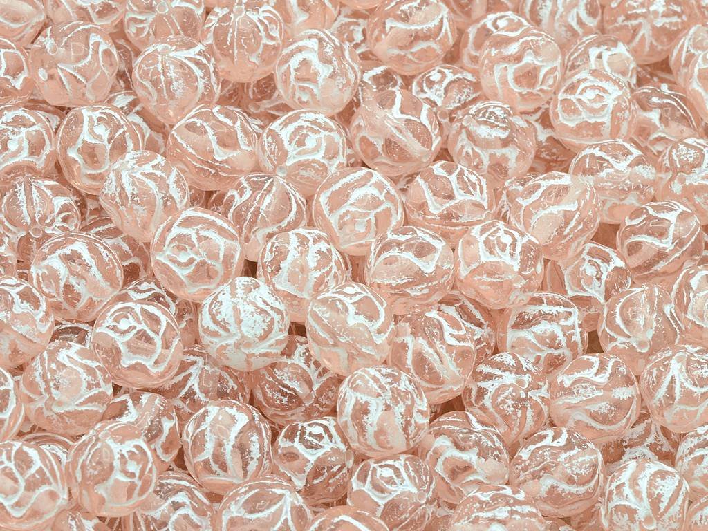 České mačkané skleněné korálky s reliéfem růže, velikost 10 mm, obsah balení 15 ks nebo níže uvedené, barva rozalín se dekorem 54312.
