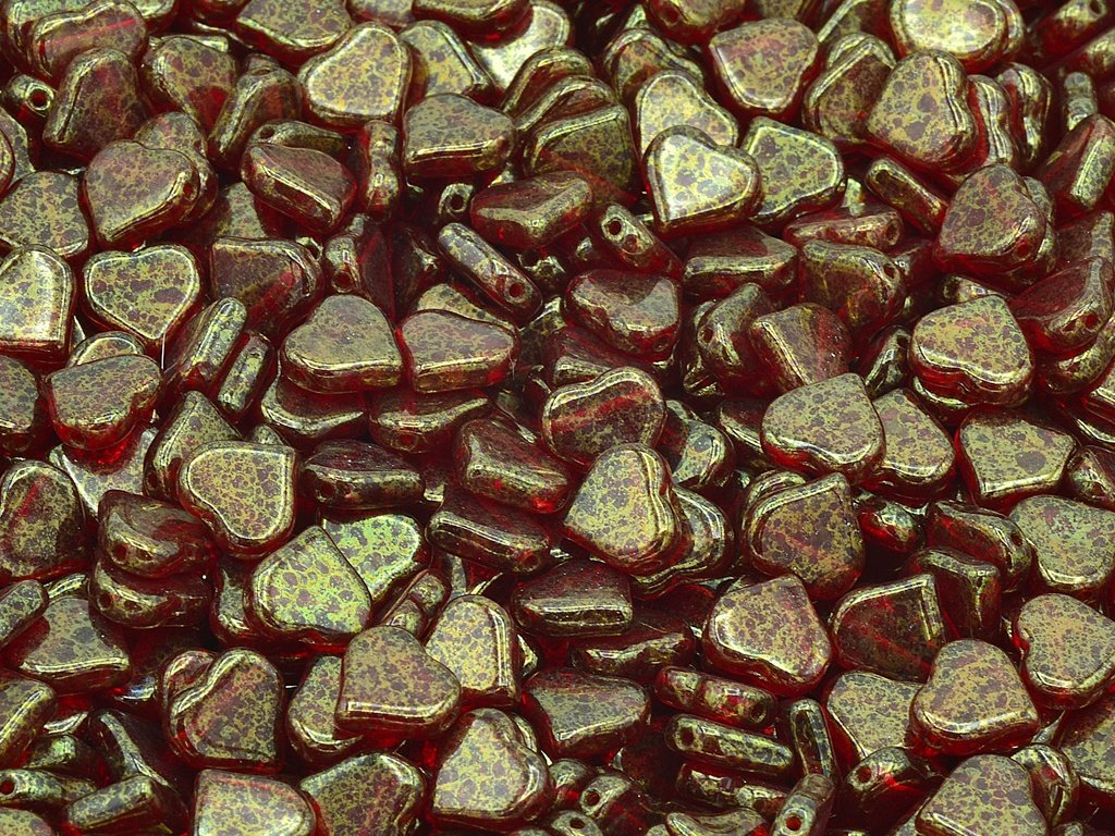 Mačkané korálky ve tvaru srdíčka, velikost 9 mm. obsah balení 15 ks nebo níže uvedené, barva rubín s dekorem 15495.