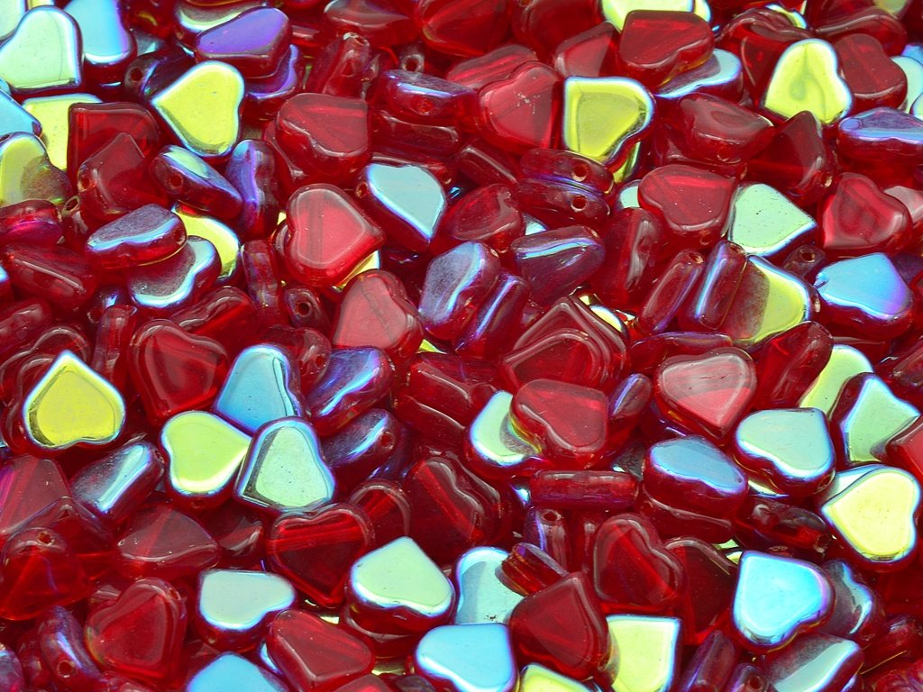 Mačkané korálky ve tvaru srdíčka, velikost 9 mm. obsah balení 15 ks nebo níže uvedené, barva rubín s dekorem 28701 (AB).